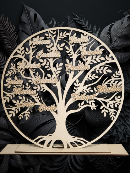 Arbre de vie en cp peuplier 3 mm avec prénom des membres de votre famille. socle de support fourni.